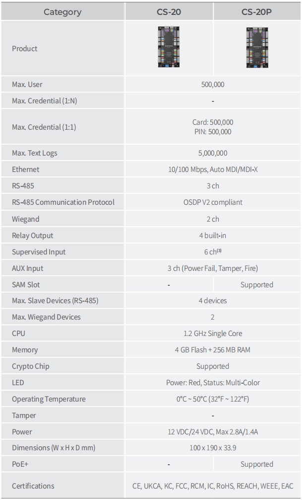 CoreStation 20 là bộ điều khiển truy cập 2 cửa được thiết kế cho mục đích bảo mật cấp doanh nghiệp. Nó hỗ trợ tối đa 500.000 người dùng, tích hợp với BioStar 2 và hỗ trợ chấm công. Hỗ trợ PoE và Khe cắm SAM để tăng cường bảo mật chỉ có trên model CS-20P, cung cấp khả năng cài đặt linh hoạt và xác thực thẻ thông minh an toàn. *PoE và Khe cắm SAM chỉ có trên model CS-20P.
